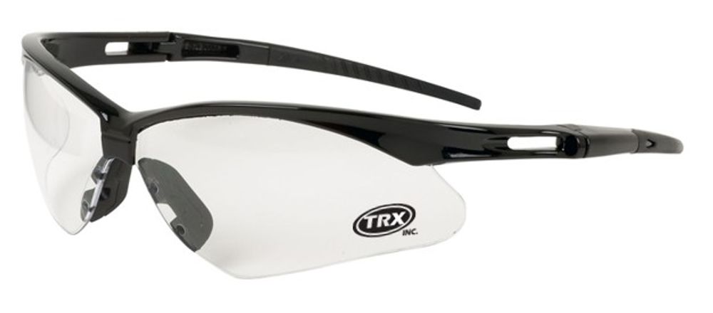 Lightweight, low profile safety glasses with bayonet-style wrap-around lenses with hinged arms, scratch-resistant clear polycarbonate lens, rubberized temple ends for comfort, and a soft rubber nosepiece to reduce slippage. Provides 99.9% UVA and UVB protection. ANSI-Z87.1 approved. Includes microfiber storage pouch and neck cord.